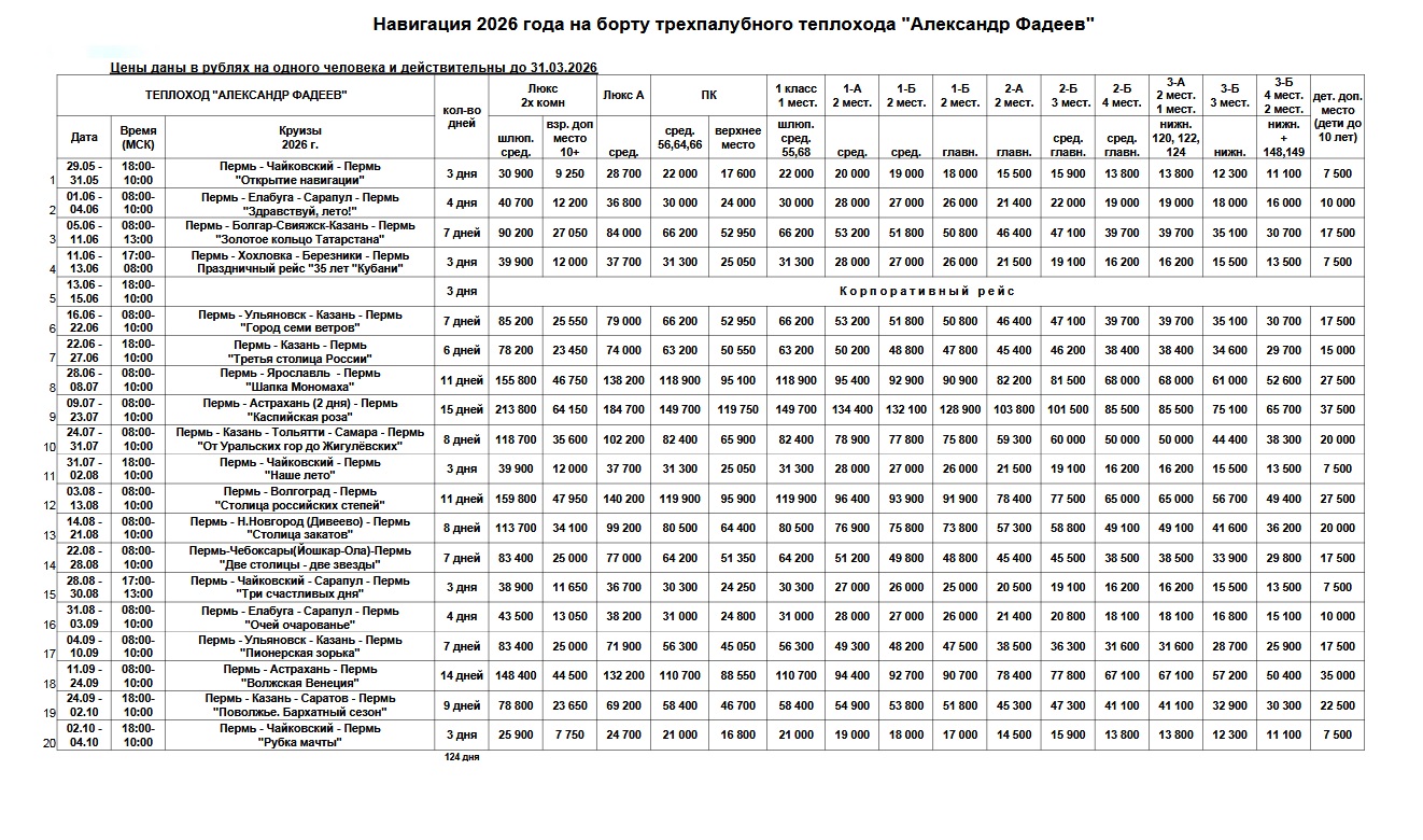 Навигация теплохода «Фадеев» в 2025 году предусматривает следование по рекам Кама, Волга и Дон. Выбрав его в качестве средства передвижения, вы сможете посетить Волгоград, Астрахань, Москву, Ярославль, Нижний Новгород, Казань, Елабугу, Чебоксары, Чайковский и другие города (конкретный перечень зависит от программы). Расписание предусматривает несколько вариантов. Вы можете отправиться в круиз как на 3 дня, так и на 16 дней — подходящий вариант найдет каждый, независимо от количества свободного времени.