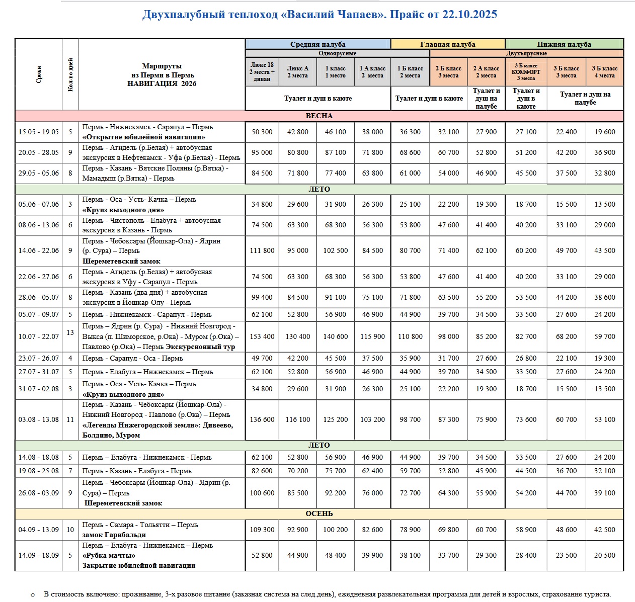 Навигация теплохода «Чапаев» в 2025 году предусматривает следование по реке Кама, Волга, . Выбрав его в качестве средства передвижения, вы сможете посетить Нижний Новгород, Казань, Елабугу, Чебоксары, Чайковский, Усть- Качка, Нижнекамск, Сарапул, Самара, Ульяновск, Березняки и другие города (конкретный перечень зависит от программы). Расписание предусматривает несколько вариантов. Вы можете отправиться в круиз как на 2 дня, так и на 11 дней — подходящий вариант найдет каждый, независимо от количества свободного времени.