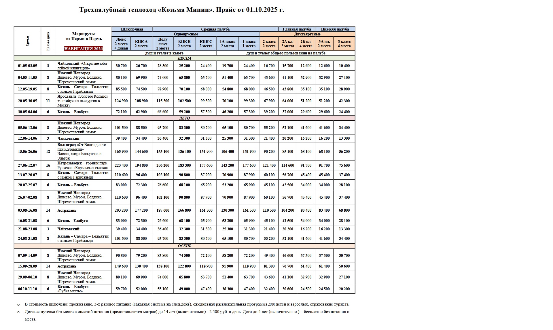 В 2026 году теплоход "Козьма Минин" отправится по многим маршрутам из Перми. Предусмотрены варианты маршрутов с посадкой/высадкой в городах Казань,Ярославль (Золотое кольцо), Елабуга, Чайковский, Челябинск, Нижний Новгород, Чебоксары, Волгоград, Ярославль, Астрахань. Вы можете отправиться в долгосрочную поездку на 14 дней в Астрахань-Волгоград или в тур выходного дня — таких вариантов также немало. В самом продолжительном 14-дневном круизе вы посетите Елабугу, Казань, Астрахань и Волгоград, в круизах до Казани и Елабуги вам будут предложены экскурсии в Йошкар-Олу и Чебоксары, также представлены классические круизы до Волгограда и Астрахани, а круиз до Астрахани расширен набирающим популярность маршрутом в Дельту Волги. И конечно же вы сможете поближе познакомиться с красотами родного Пермского края в круизах до Чайковского.