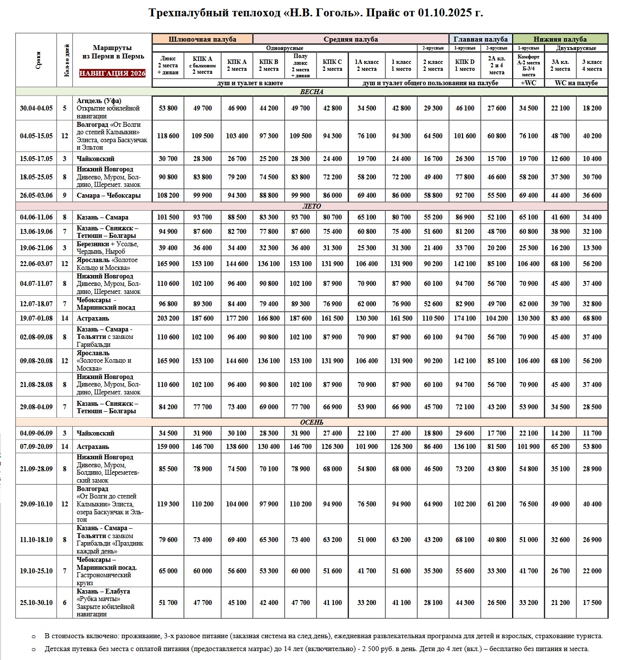 Сезон длится с мая по октябрь. Расписание теплохода «Н.В.Гоголь» в 2026 году предусматривает 16 программ, которые отличаются маршрутом следования и продолжительностью поездки. Чтобы отдохнуть от рабочих будней, вы можете заказать тур на 3 дня и посетить в рамках него Чайковский и Сарапул. Если же вы строите планы на отпуск, выбирайте одну из долгосрочных программ.Отправляясь из Перми, теплоход «Гоголь» следует в Санкт-Петербург (Кижи, Валаам), Ярославль, Самару, Саратов, Чебоксары (Йошкар-Ола), Нижний Новгород, Волгоград, Ярославль (Золотое кольцо) и другие города, расположенные по течению рек Кама, Волга, Нева.