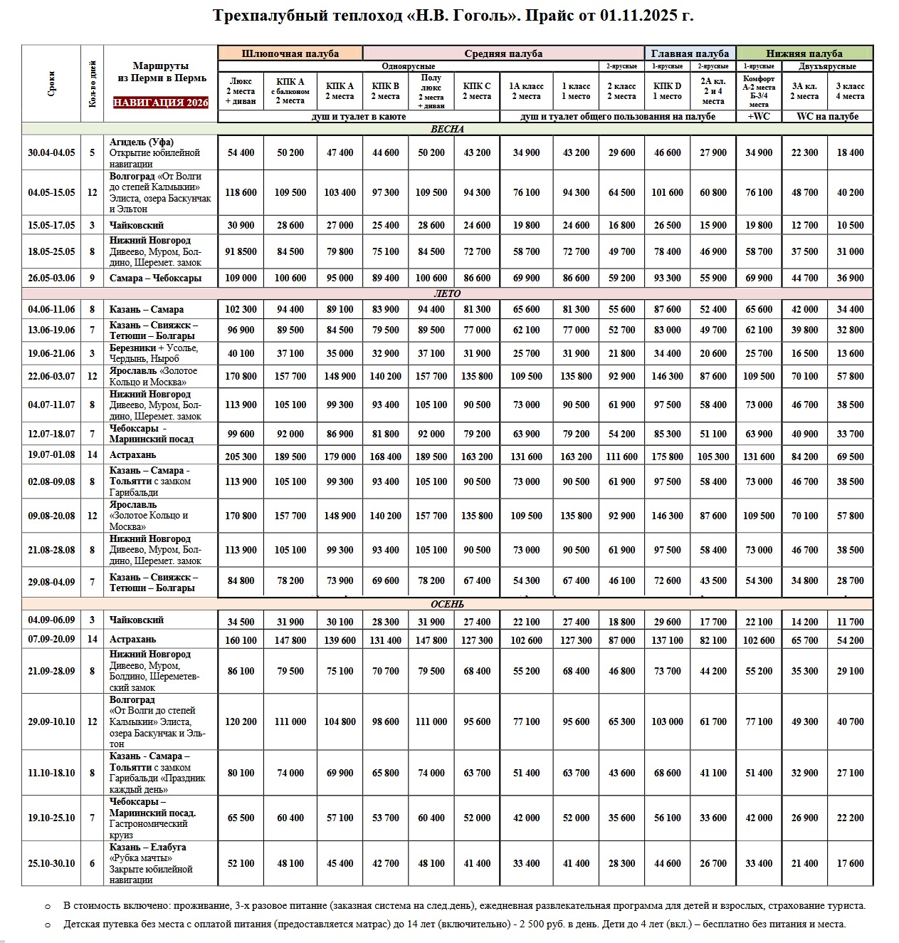 Сезон длится с мая по октябрь. Расписание теплохода «Н.В.Гоголь» в 2026 году предусматривает 16 программ, которые отличаются маршрутом следования и продолжительностью поездки. Чтобы отдохнуть от рабочих будней, вы можете заказать тур на 3 дня и посетить в рамках него Чайковский и Сарапул. Если же вы строите планы на отпуск, выбирайте одну из долгосрочных программ.Отправляясь из Перми, теплоход «Гоголь» следует в Санкт-Петербург (Кижи, Валаам), Ярославль, Самару, Саратов, Чебоксары (Йошкар-Ола), Нижний Новгород, Волгоград, Ярославль (Золотое кольцо) и другие города, расположенные по течению рек Кама, Волга, Нева.