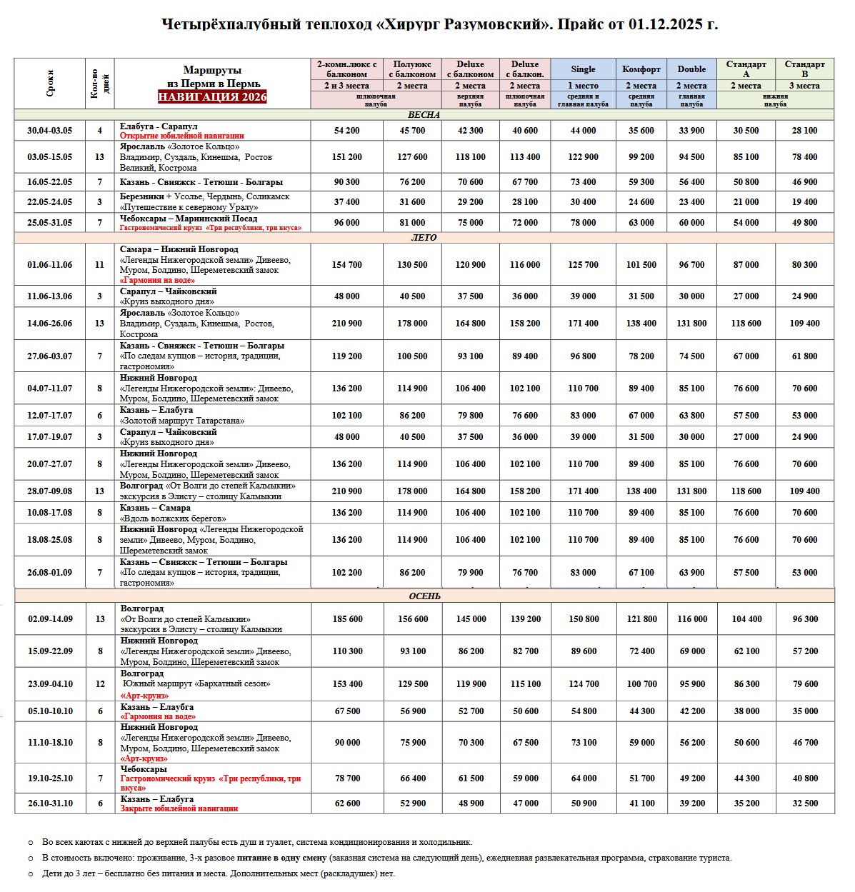 Навигация теплохода «Разумовский» в 2026 году предусматривает следование по рекам Кама, Волга. Выбрав его в качестве средства передвижения, вы сможете посетить Волгоград, Астрахань, Москву, Ярославль, Нижний Новгород, Казань, Елабугу, Чебоксары, Чайковский и другие города (конкретный перечень зависит от программы). Расписание предусматривает несколько вариантов. Вы можете отправиться в круиз как на 3 дня, так и на 15 дней — подходящий вариант найдет каждый, независимо от количества свободного времени.
