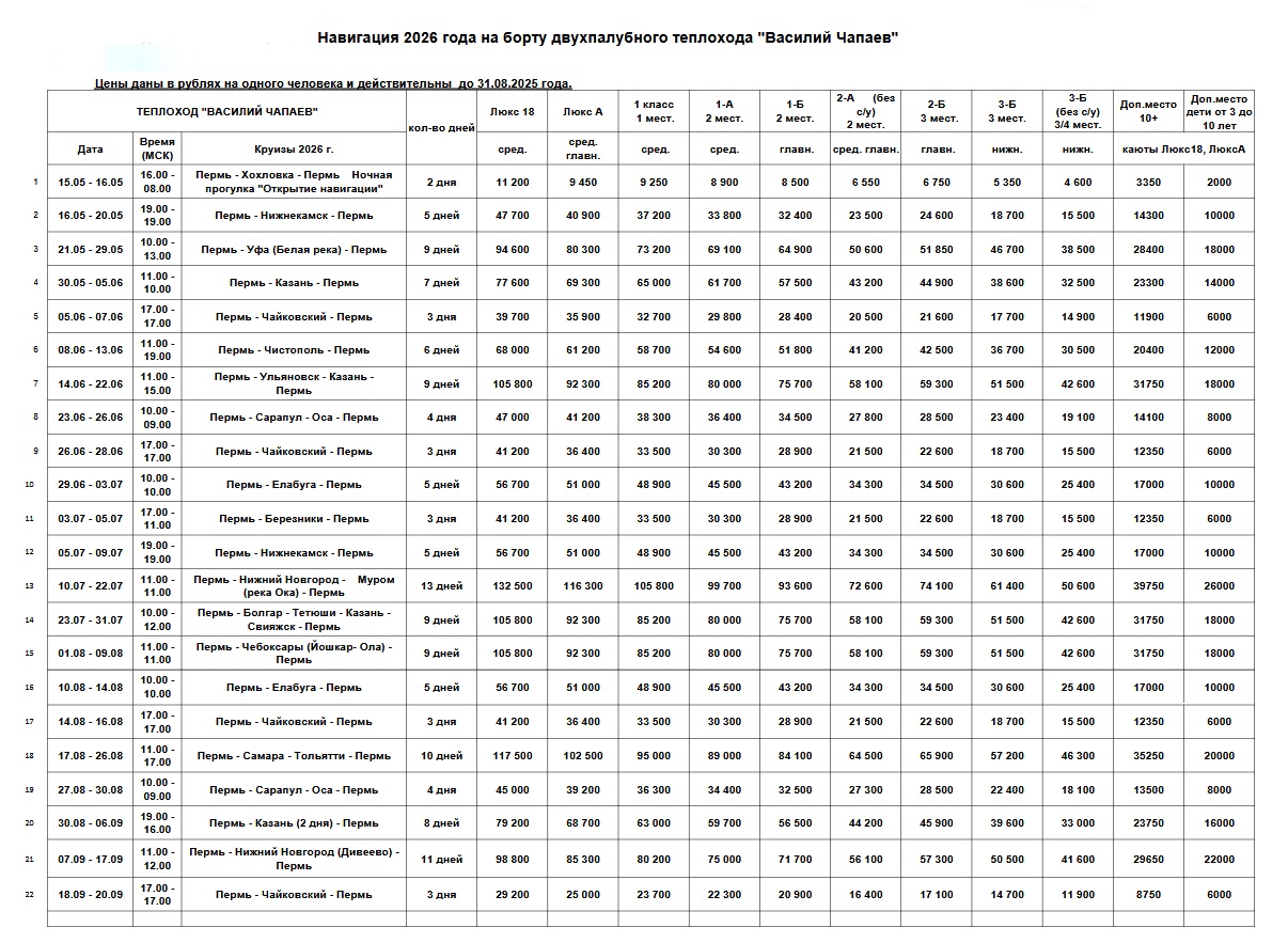 Навигация теплохода «Чапаев» в 2025 году предусматривает следование по реке Кама, Волга, . Выбрав его в качестве средства передвижения, вы сможете посетить Нижний Новгород, Казань, Елабугу, Чебоксары, Чайковский, Усть- Качка, Нижнекамск, Сарапул, Самара, Ульяновск, Березняки и другие города (конкретный перечень зависит от программы). Расписание предусматривает несколько вариантов. Вы можете отправиться в круиз как на 2 дня, так и на 11 дней — подходящий вариант найдет каждый, независимо от количества свободного времени.