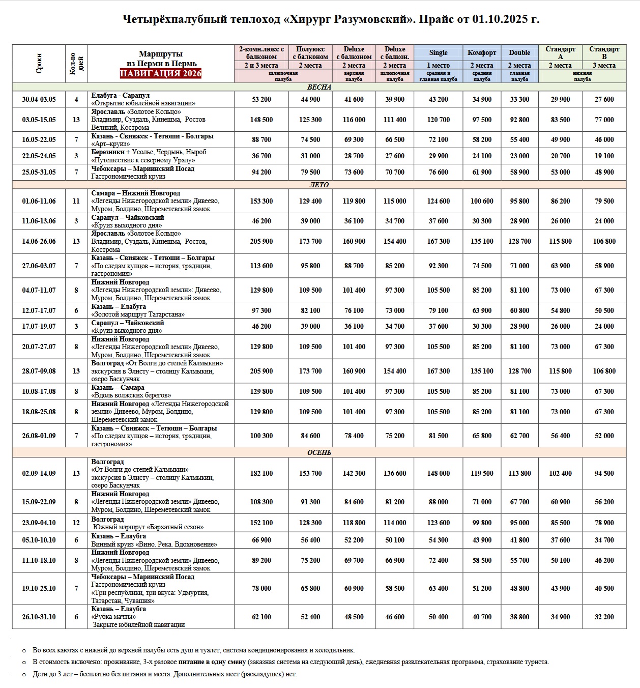 Навигация теплохода «Разумовский» в 2026 году предусматривает следование по рекам Кама, Волга. Выбрав его в качестве средства передвижения, вы сможете посетить Волгоград, Астрахань, Москву, Ярославль, Нижний Новгород, Казань, Елабугу, Чебоксары, Чайковский и другие города (конкретный перечень зависит от программы). Расписание предусматривает несколько вариантов. Вы можете отправиться в круиз как на 3 дня, так и на 15 дней — подходящий вариант найдет каждый, независимо от количества свободного времени.