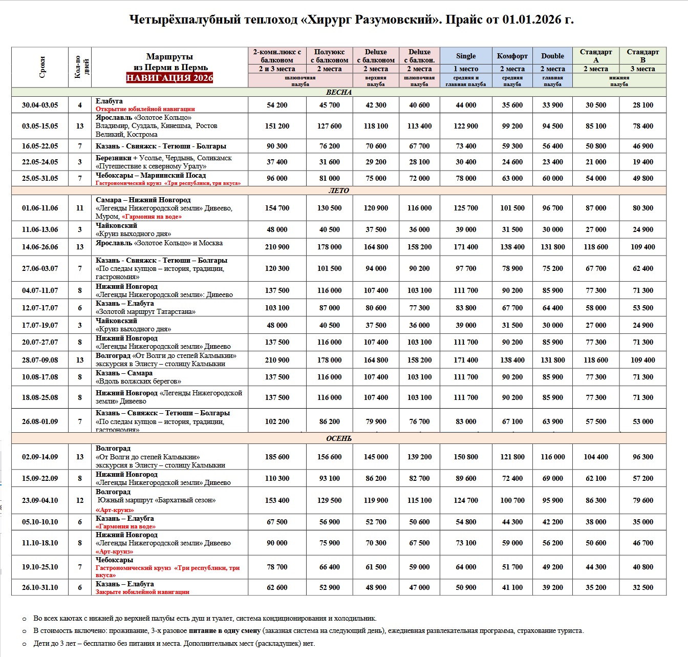 Теплоход «Хирург Разумовский» имеет каюты категории «Люкс», комфортабельные одно, двух и трехместные каюты со всеми удобствами.Все каюты имеют санузел, душ, умывальник, шкаф для одежды, систему кондиционирования, холодильник, радио.